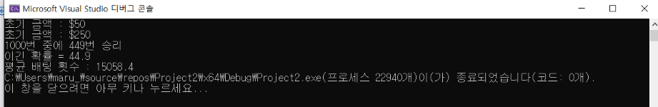 cout << "1000번 중에 " << betSuccessCnt << "번 승리" << endl;