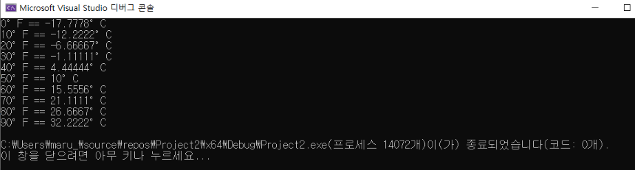 9번. 반복문을 이용하여 화씨 온도 0도부터 100까지의 구간에 대하여 10도 간격으로 섭씨 온도로 환산하는 표를 작성하라. c = (f-32.0) * 5.0 / 9.0; 수식으로 화씨 온도를 섭씨 온도로 변환할 수 있다.